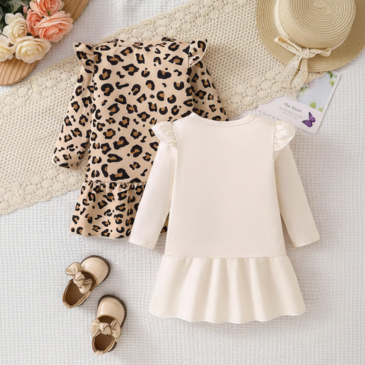 Mädchen Kleid Set (2-teilig) – Langarmkleider im Leo-Design & Creme