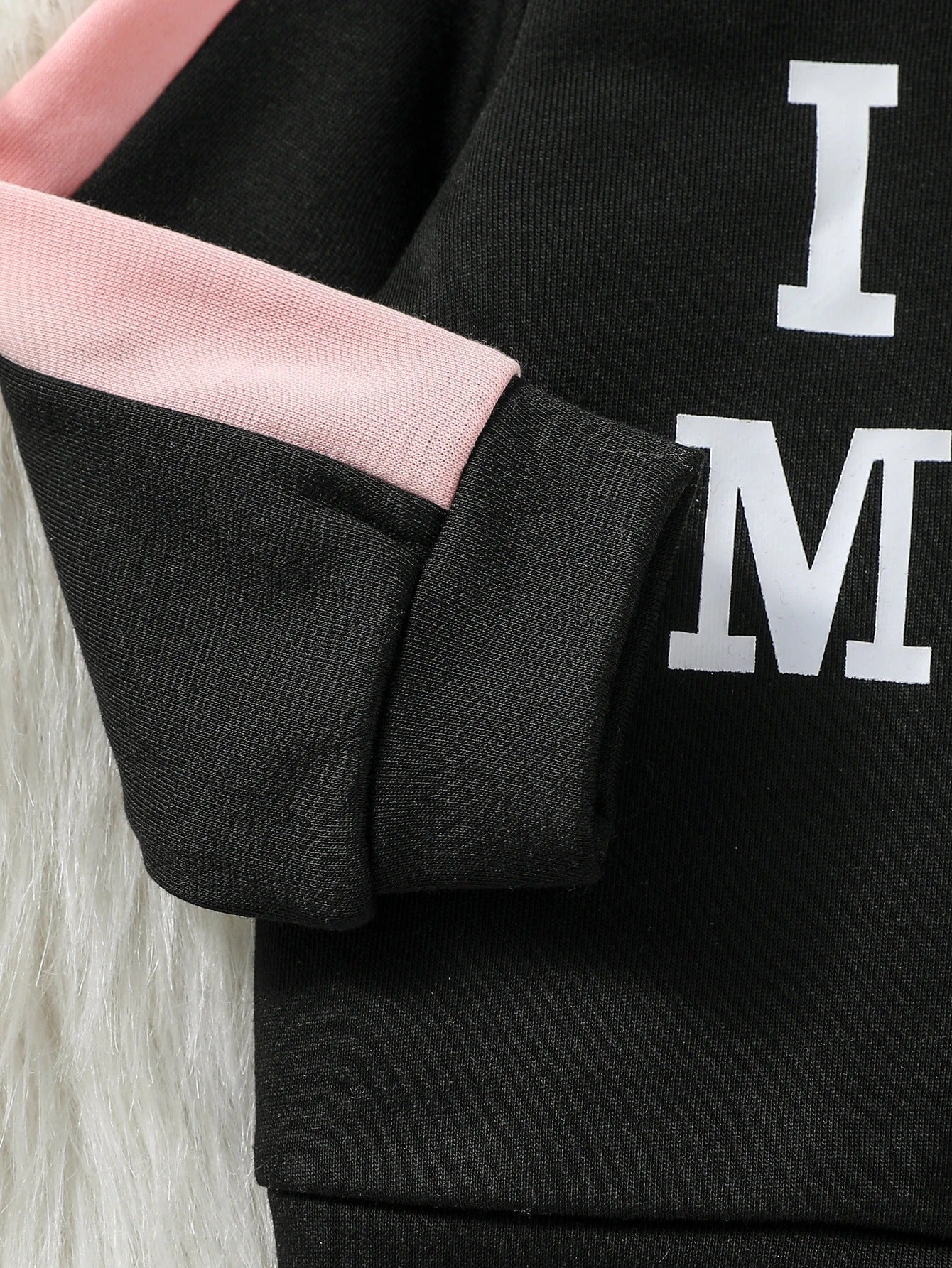 Das Set besteht aus einem Kapuzenpullover mit Aufdruck „I ❤️ MOM“ und einer passenden Hose mit „I ❤️ DAD“-Print.