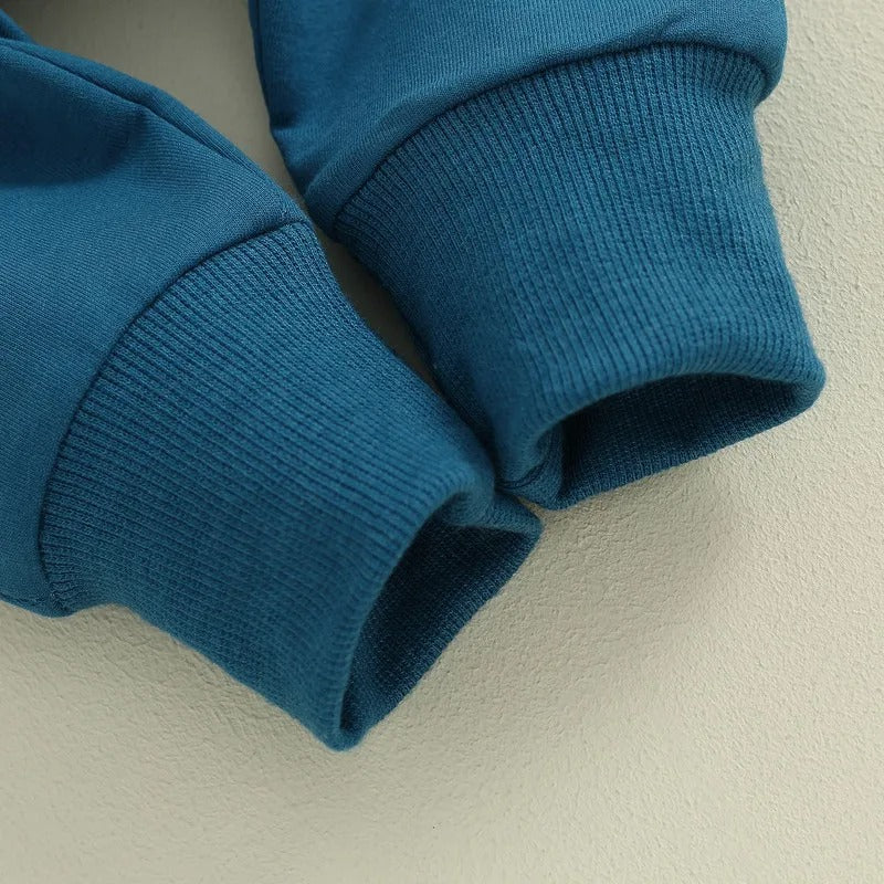 Die Ärmelenden und Hosenbeinenden sind mit Bündchen versehen, um sicherzustellen, dass Ihr kleiner Schatz warm bleibt. Die Eingriffstaschen im Bauchbereich sind ideal für kleine Fundstücke und verleihen dem Overall einen verspielten Touch.