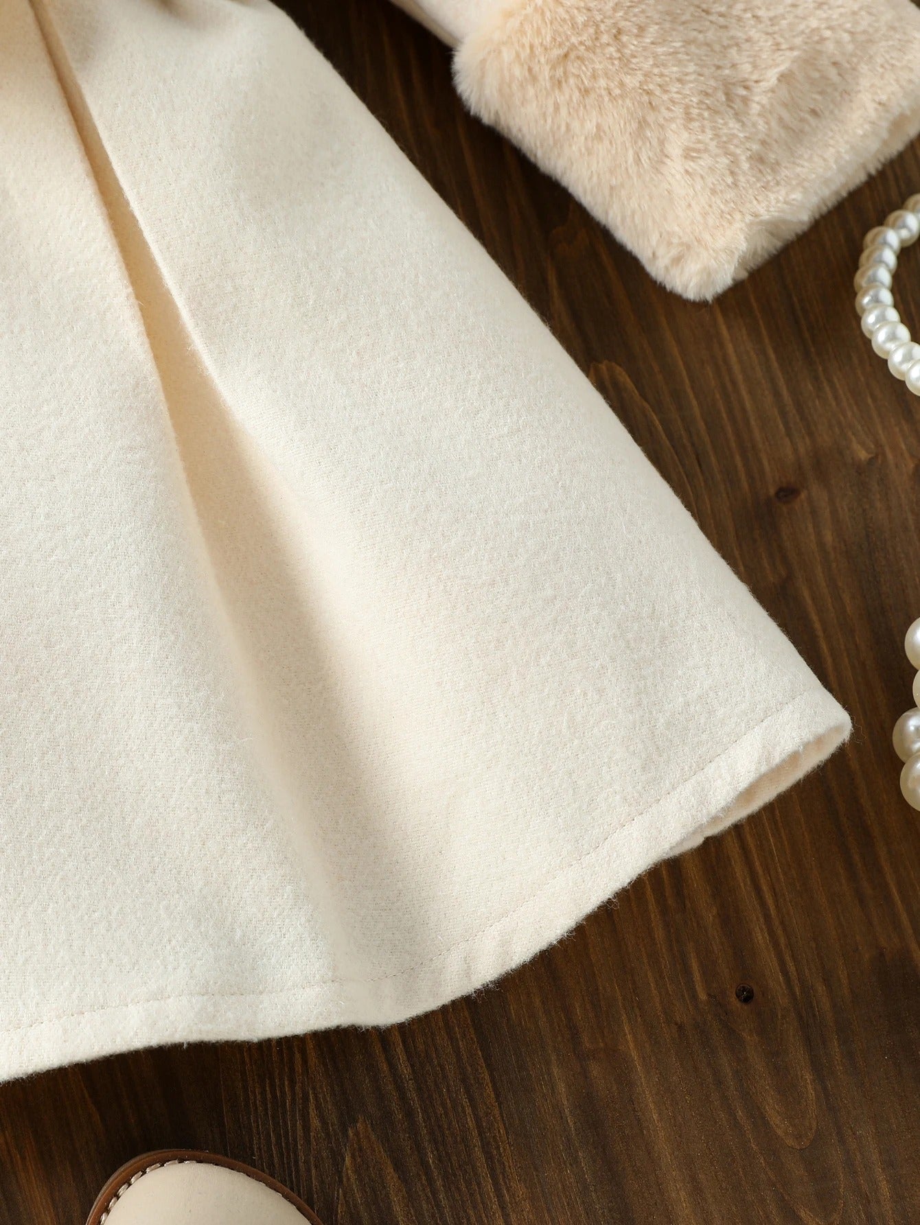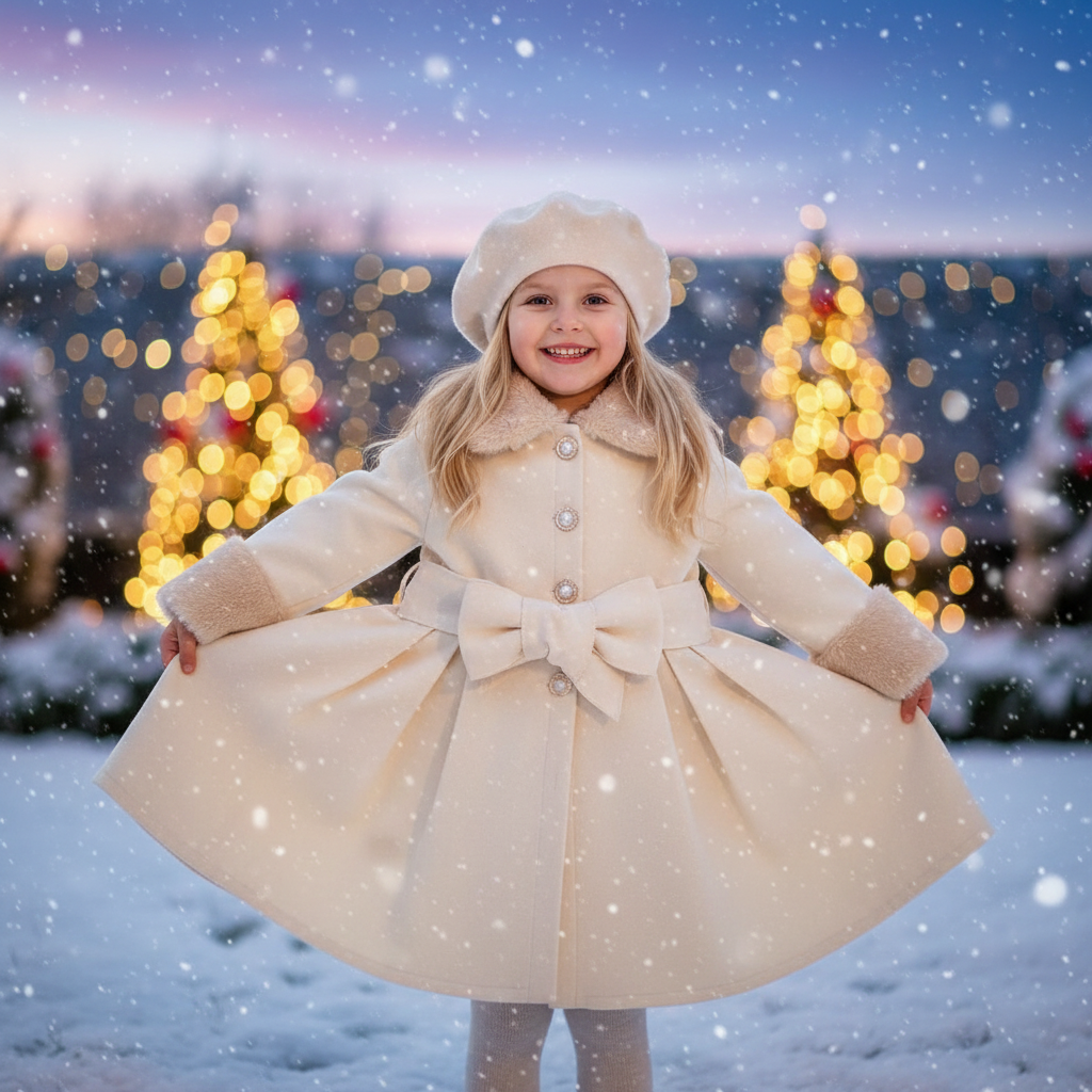 Zartes Creme, edle Perlenknöpfe und das weiche Innenfutter machen ihn zum perfekten Begleiter für festliche Anlässe, Familienfotos oder Spaziergänge an Wintertagen.