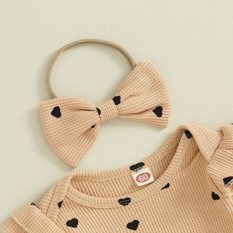 Jedes Detail dieses Sets wurde mit größter Sorgfalt entworfen. Die niedlichen Herzmuster verleihen dem Outfit einen verspielten Charme, während die Rüschen an den Schultern einen Hauch von Eleganz hinzufügen. Die harmonische Farbpalette – Beige, Creme und Rosa – lässt sich mühelos kombinieren und passt zu jedem Anlass.