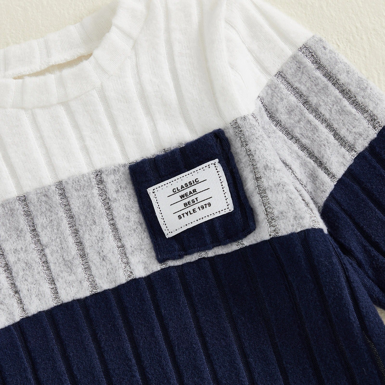 Dieses zweifarbige Strickset für Jungen ist der ideale Begleiter für kühle Tage. Der Pullover mit moderner Blockoptik und strukturierter Rippstrick-Oberfläche wirkt sportlich-elegant, während die passende Hose für viel Bewegungsfreiheit und Gemütlichkeit sorgt.